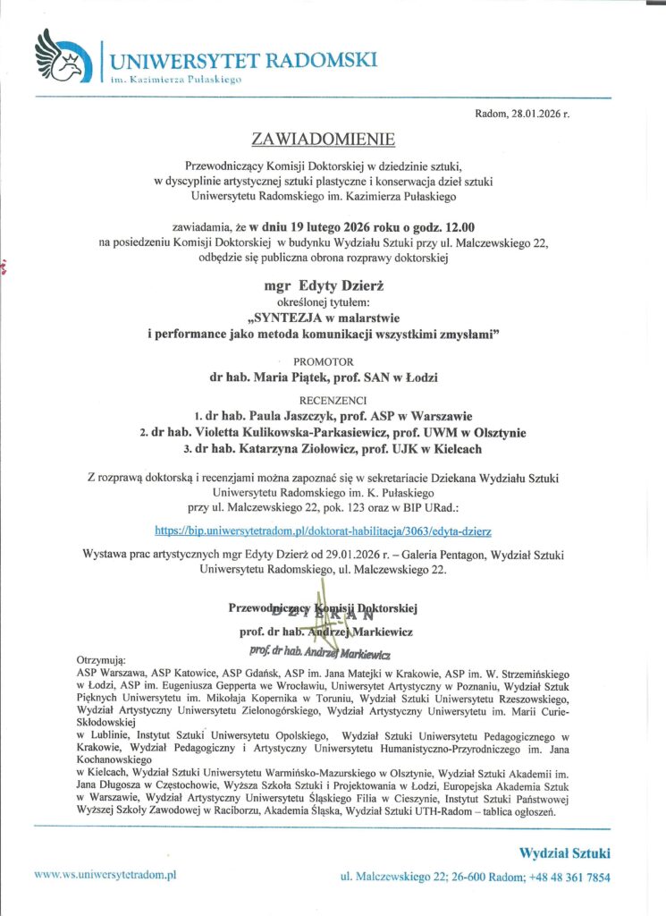 ZAWIADOMIENIE O PUBLICZNEJ OBRONIE DOKTORATU